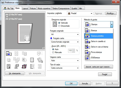 In [Metodo di uscita] sulla scheda [Base], selezionare [Stampa protetta].