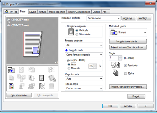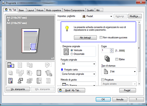 A15. Sì. La finestra può essere personalizzata facilmente dalla finestra delle proprietà del driver di stampa, registrando le funzioni utilizzate di frequente collettivamente da My Tab (La mia scheda), oppure registrando le impostazioni delle rispettive schede come preferite per l'attivazione rapida.