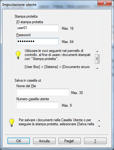 La stampa sicura è utile per autorizzare un numero limitato di utenti che conoscono la password assegnata al documento. ID e stampa permette di stampare solamente all'utente che ha effettuato la login.