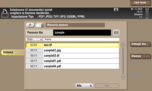 Selezionare una cartella, quindi premere [Apri] per elencare i documenti e le cartelle contenuti nella cartella prescelta. Premere [Alto] per tornare alla posizione superiore di un livello.