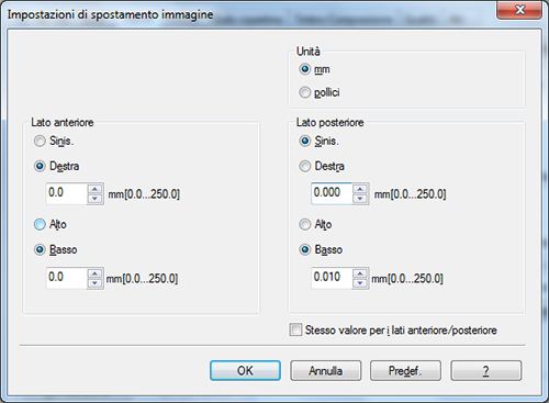 [Lato anteriore]/[Lato posteriore] | Impostare la direzione e il valore di spostamento della posizione di stampa. Nella stampa su 2 lati, selezionando la casella di controllo [Stesso valore per i lati anteriore/posteriore] è possibile impostare lo stesso valore per i lati anteriore e posteriore. |