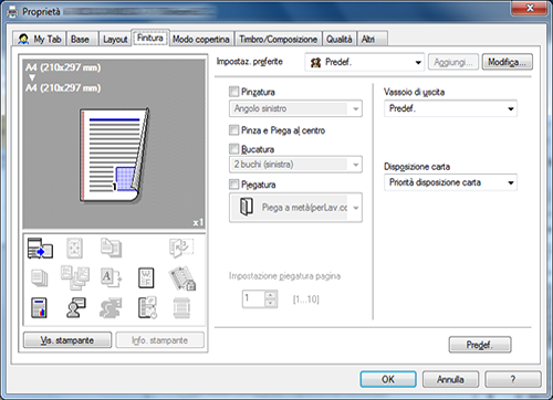 Selezionare la casella di controllo della finitura desiderata sulla scheda [Finitura]. Se è stata selezionata la casella di controllo [Pinzatura], [Bucatura] oppure [Piegatura], specificare la quantità, le posizioni e le altre impostazioni necessarie.