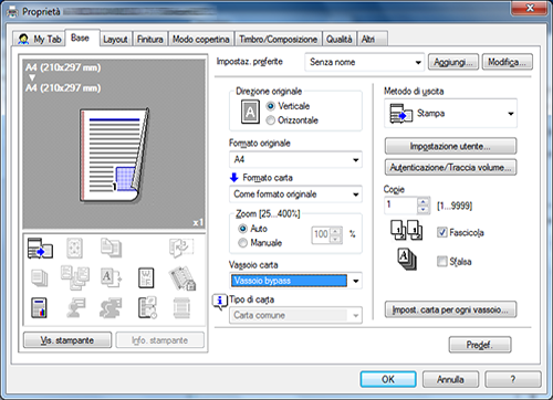 In [Vassoio carta] sulla scheda [Base], selezionare un'opzione diversa da [Auto].