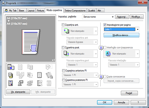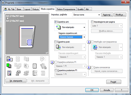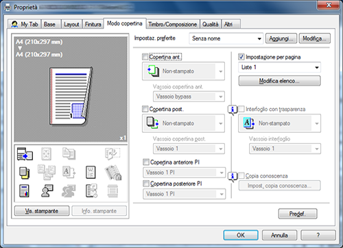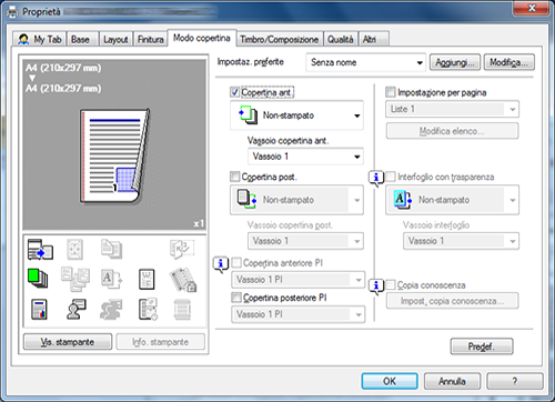 Per stampare una copertina su un tipo di carta diverso, selezionare la casella di controllo [Copertina ant.] sulla scheda [Modo copertina].