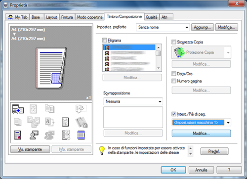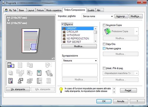 Sulla scheda [Timbro/Composizione], selezionare la casella di controllo [Filigrana], quindi selezionare la filigrana.