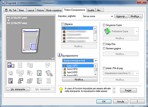 Per stampare un documento sopra al prodotto di un file creato su un computer, selezionare [Stampa immagine host] da [Sovrapposizione] sulla scheda [Timbro/Composizione], quindi selezionare il file della stampa in sovrapposizione.
