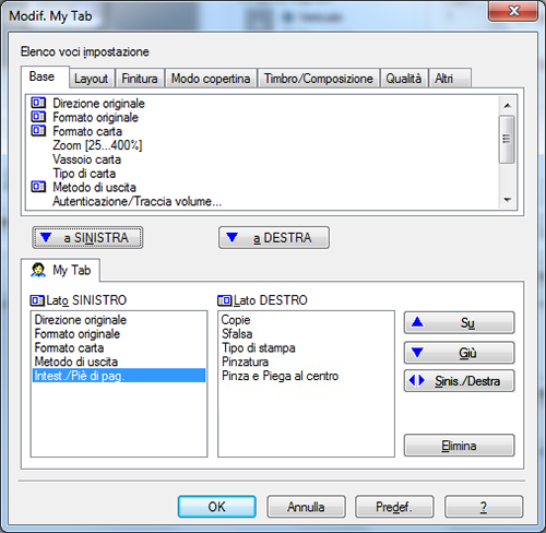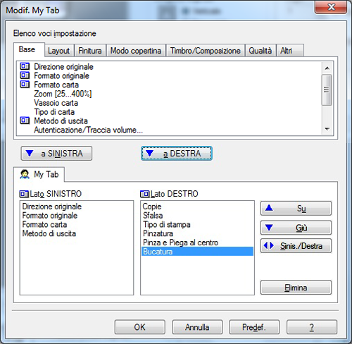 Per riorganizzare le funzioni registrate su My Tab, selezionare la funzione che si desidera ricollocare su [My Tab], quindi fare clic su [Su], [Giù], oppure [Sinis./Destra].