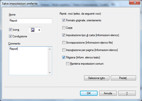 [Nome] | Immettere il nome delle impostazioni preferite. |