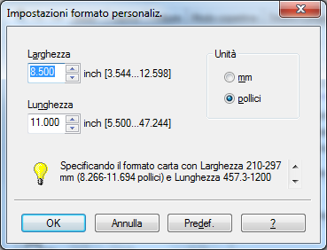 Inserire i valori per la [Larghezza] e [Lunghezza] della carta da stampare, quindi fare clic su [OK].