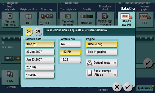 Premere [ON], impostare i valori per le opzioni [Formato data], [Formato ora] e [Pagine], quindi premere [OK].