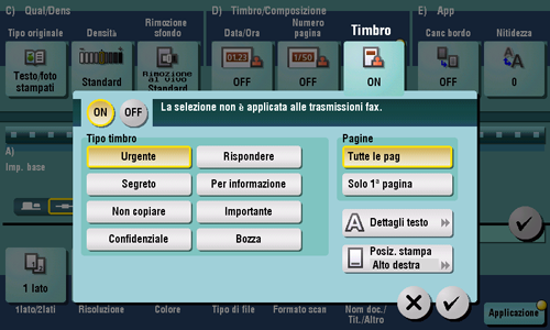 Premere [ON], impostare i valori per [Tipo timbro] e [Pagine], quindi premere [OK].
