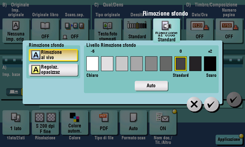 Premere [Applicazione] per selezionare il [Tipo originale], quindi scegliere un'opzione in base alla qualità dell'originale da scansionare.
