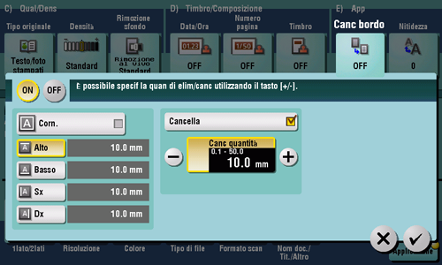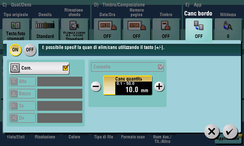 Per specificare individualmente la larghezza di ciascun bordo da cancellare, premere [Corn.] per deselezionare la casella di controllo, selezionare il lato desiderato e premere [+] o [-] per specificare la larghezza da eliminare.