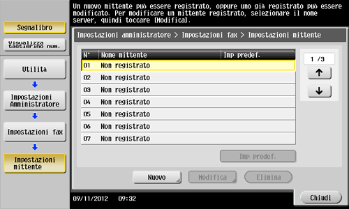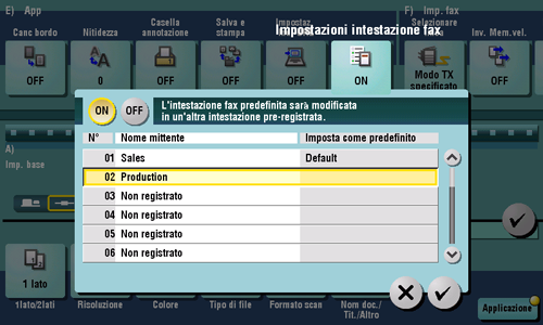 Per impostare il nome mittente predefinito, selezionare un nome mittente e premere [Imp predef.].