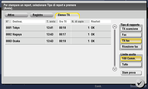 Specificare un tipo di rapporto in [Tipo di rapporto] nella scheda [Elenco TX], quindi premere [Conferma selezione] e premere Avvio.