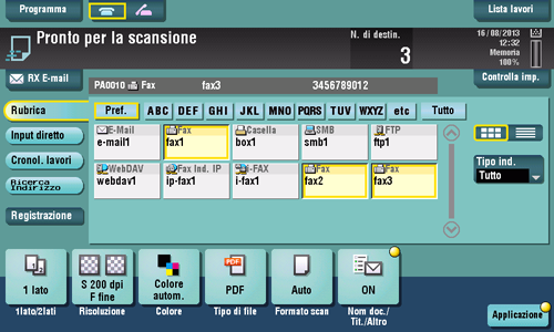 [Indice] | Selezionare un testo da cercare. Le destinazioni di gruppo sono visualizzate nella schermata superiore della modalità fax/scansione, ordinate secondo il carattere dell'indice specificato qui. Per una destinazione utilizzata frequentemente, specificare i caratteri dell'indice e al contempo selezionare [Preferiti]. Questa opzione consente di effettuare la ricerca in modo più semplice. |