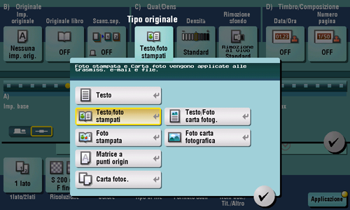 Premere [Applicazione] per selezionare il [Tipo originale], quindi scegliere un'opzione in base alla qualità dell'originale da trasmettere via fax.