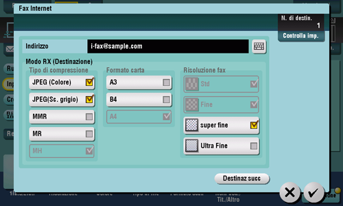 Inserire l'indirizzo e-mail della destinazione in [Indirizzo] e selezionare il formato di compressione, il formato carta e la risoluzione supportata dalla macchina destinataria da [Modo RX (Destinazione)].