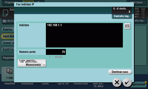 Inserire, in alternativa, l'indirizzo IP, il nome host oppure l'indirizzo e-mail della destinazione in [Indirizzo], il numero porta utilizzato per la trasmissione fax in [Numero porta], quindi selezionare l'opzione [Colore] oppure [Monocromia] da [Tipo macchina destinaz.].