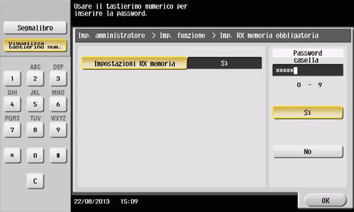 Selezionare una linea, premere [Sì], inserire la password destinata all'elaborazione dei fax salvati nella casella utente utilizzando la tastiera, quindi fare clic su [OK].