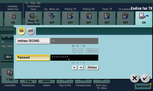 Premere [ON] e selezionare [Indirizzo SECOND.] quindi, utilizzando la tastiera, inserire il numero della casella utente di rilancio della macchina di rilancio.