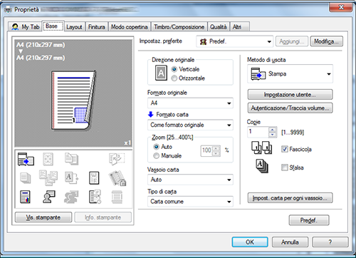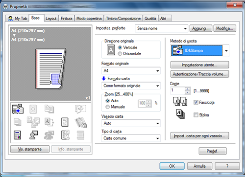 A3. Sì, si devono immettere le informazioni della [Autenticazione Utente] nel driver all'esecuzione della funzione ID e stampa, e inoltre impostare [ID e Stampa] come metodo di uscita.