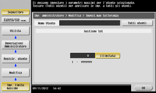 Fare clic su [Imp. limite massimo], quindi specificare il limite massimo del numero di originali che un utente può stampare, utilizzando la tastiera.