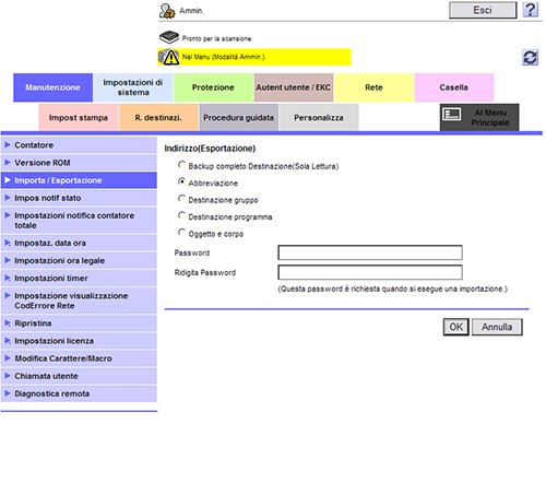Una volta eseguita l'esportazione con l'inserimento della password, l'importazione delle destinazioni in un altro MFP richiederà di inserire la password.