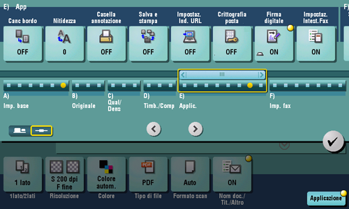 [Impostazioni PDF dettagl.] | Se per il formato file è stato selezionato [PDF] o [PDF compatto], è possibile configurare le impostazioni opzione PDF. È possibile incrementare la sicurezza allegando una firma digitale che identifica l'autore di un file, attraverso la crittografia file, ecc. Per informazioni dettagliate, fare riferimento a Qui. |