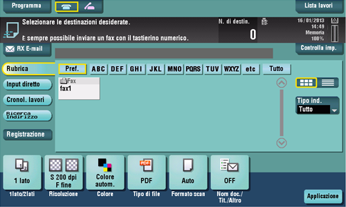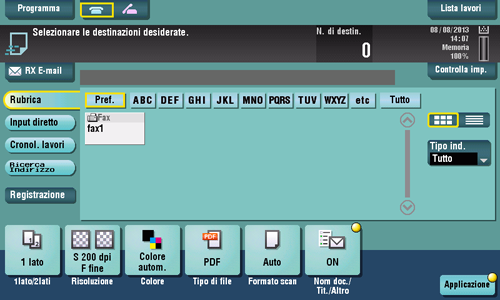 Se necessario, è possibile modificare la visualizzazione della schermata principale in modo fax/scansione (predefinito: [Rubrica]). Per informazioni dettagliate, fare riferimento a Qui.