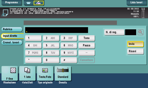 I numeri di fax possono essere specificati da [Rubrica], [Input diretto], [Cronol. lavori] oppure [Programma]. Per informazioni dettagliate sulla modalità di specifica di una destinazione, fare riferimento a Qui. Per informazioni dettagliate su come specificare un programma fax/scansione, fare riferimento a Qui.