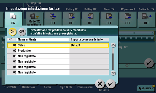Fare clic su [Applicazione] - [Imp. fax] - [Codice fax TX], e infine [ON].
