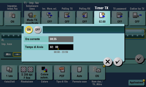 Fare clic su [Applicazione] - [Imp. fax] - [Timer TX] e quindi [ON].