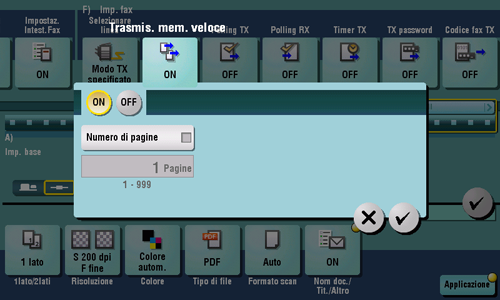 Trasmis. mem. veloce è un metodo per avviare l'invio di fax non appena una pagina dell'originale sia stata scansionata. Il numero totale di pagine trasmesse può essere inserito nelle informazioni sul mittente.