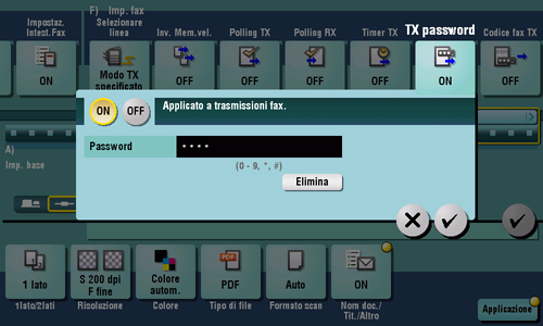 TX Password è una funzione per l'invio di fax con password. È utilizzata per inviare fax a un dispositivo sul quale i peer sono limitati da password (un dispositivo con ricezione in rete chiusa attivata).