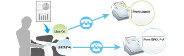 La funzione di distribuzione rilancio invia il fax a una macchina di rilancio, che distribuisce il fax ricevuto ad un gruppo pre-registrato di destinazioni.