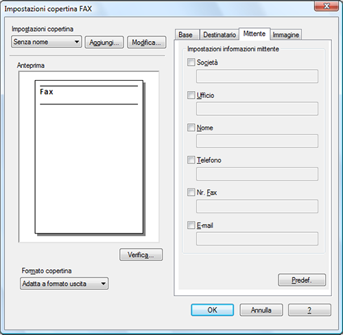 Inserire le informazioni del mittente nella scheda [Mittente] (utilizzando fino a 80 caratteri per ciascuna voce).