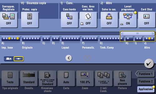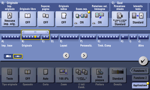 Gli originali sono scansionati in base a diverse impostazioni per ogni set e copiati in maniera collettiva. Utilizzare questa funzione quando vari tipi di originali sono misti, come originali 1 lato da stampare su un lato della carta e originali 2 lati da copiare con ingrandimento.