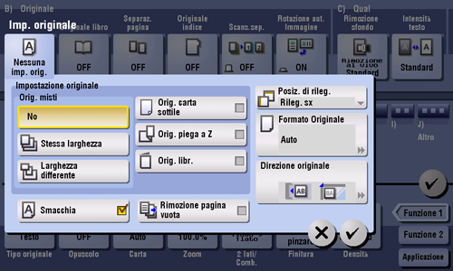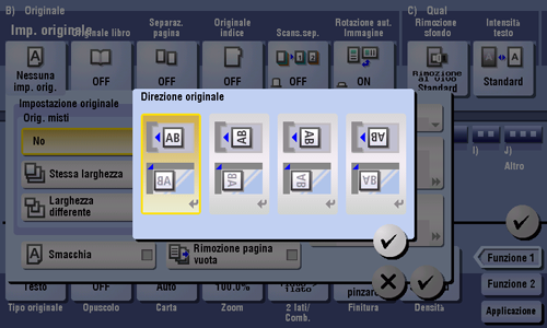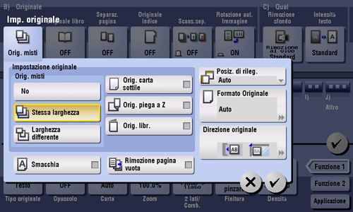 Anche per un originale con pagine di diversi formati, utilizzando l'ADF è possibile scansionare i dati mentre si rileva il formato di ogni pagina. Se le larghezze degli originali sono identiche, selezionare [Stessa larghezza]. Se le larghezze degli originali sono differenti, selezionare [Larghezza differente].