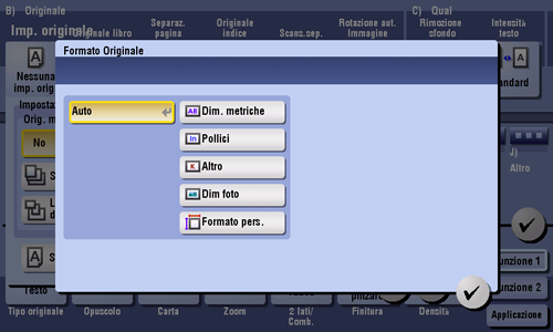 Se il formato dell'originale non viene rilevato correttamente, selezionare un tasto indicante il formato dell'originale da scansionare. Se la macchina non rileva il formato di originali o foto dal formato irregolare, specificare manualmente il formato.