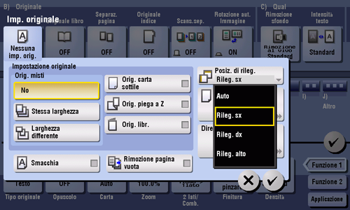 [Rileg. sx] | Selezionare questa opzione quando viene specificata la posizione di rilegatura sul lato sinistro dell'originale. |