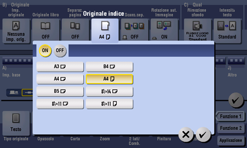 [ON]/[OFF] | Selezionare [ON] per copiare un originale indice. Selezionare inoltre il formato dell'originale indice. |