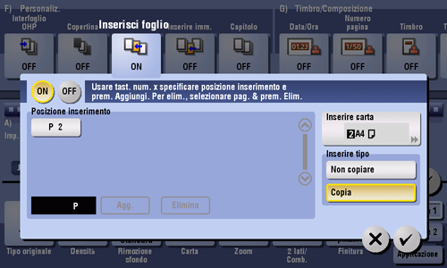 [ON]/[OFF] | Selezionare [ON] per specificare Inserisci foglio. |