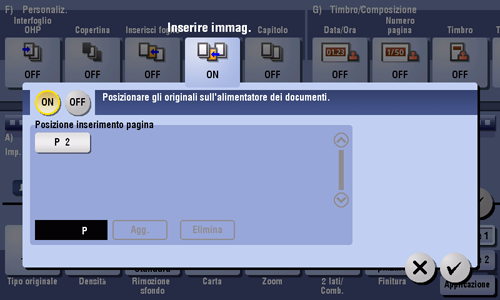 [ON]/[OFF] | Selezionare [ON] per specificare Inserire immagine. |