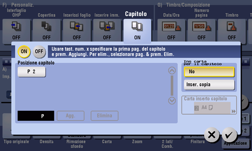 [Carta inserto capitolo] | Se [Ins carta per il capitolo] è impostato su [Inser. copia], selezionare il vassoio carta in cui è impilata la Carta capitolo. Se la carta capitolo e quella testo differiscono, usare carta dello stesso formato e impilarla nella direzione corretta. |