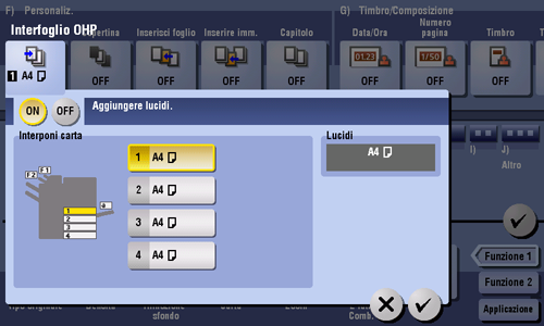 [ON]/[OFF] | Selezionare [ON] per specificare Interfoglio OHP. |