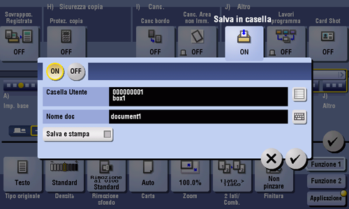 [Salva e stampa] | Impostare questa opzione per salvare il documento in una casella utente e stamparlo contemporaneamente. |