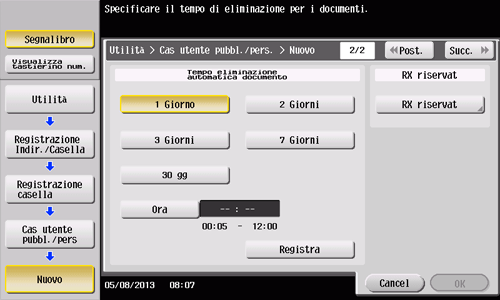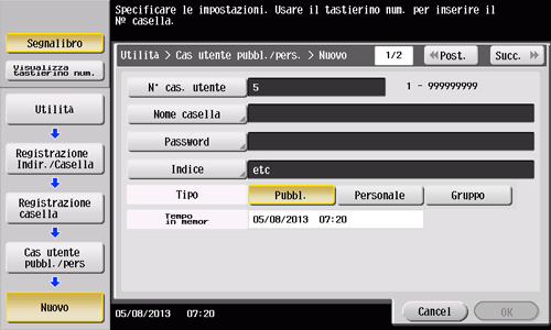 Premere [Utilità] - [Registraz. destinaz./ casella] - [Registrazione casella] - [Cas utente pubbl./pers] - [Nuovo].