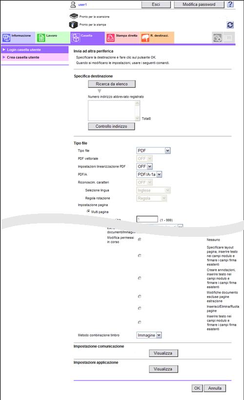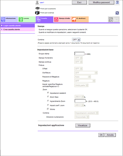 [Impostazioni applicazione] | Configurare un'impostazione più dettagliata, come Timbro o Invia e stampa. Quando si usa questa funzione fare clic su [Visualizza]. |