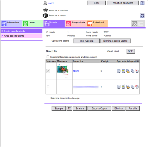 Se un file può essere spostato o copiato in un'altra casella utente, una casella di controllo è visualizzata nella colonna [Seleziona]. Inoltre, il simbolo è visualizzato nella colonna [Operazioni disponibili].